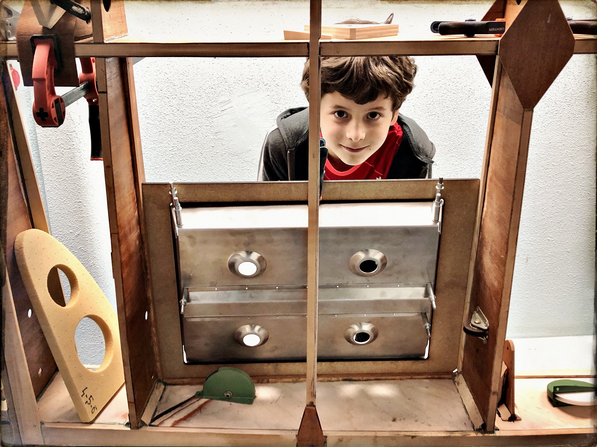 La fraiseuse à panneau a bien servie pour usiner la trappe et la contreplaque dans une plaque d'aluminium. On aime le guillochage tracé par la fraise.